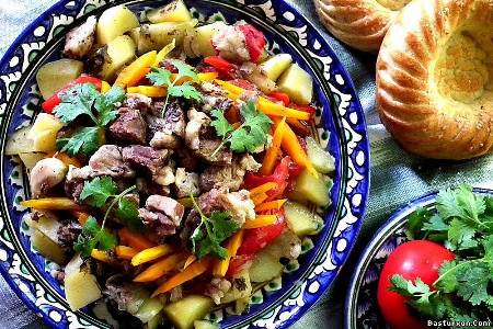 «У нас очень любят мясо: баранину, говядину, конину, птицу... Мясо всегда было на столе круглый год, не смотря на то, что холодильников, конечно, не было. Но скот забивали по очереди, хозяева обязательно делились со всеми соседями, сушили, солили, вялили мясо. Вообще узбекская кухня — это кухня оседлого народа — в Узбекистане жили крестьяне и искусные ремесленники». Ташкентский, ферганский и самаркандский оазисы издавна служили важнейшим перекрестком торговых путей, поэтому здесь происходила встреча разных культур, под влиянием которых формировались особенности питания населения. Происхождение многих узбекских блюд имеет общие корни с традиционными азиатскими блюдами. Среди них плов, лагман, манты, самса. Кулинарные традиции кочевых народов привнесли в узбекскую кухню любовь к мясу и молочным продуктам. Оседлый образ жизни привел к изобилию в кулинарной традиции овощей, фруктов, блюд из зерновых и бобовых культур», отмечалось в репортаже государственной телекомпании стран СНГ «Мир». Также особо подчеркивалось в репортаже, что специи — ключевой компонент узбекской кухни, именно они придают баранине удивительный пряный аромат.